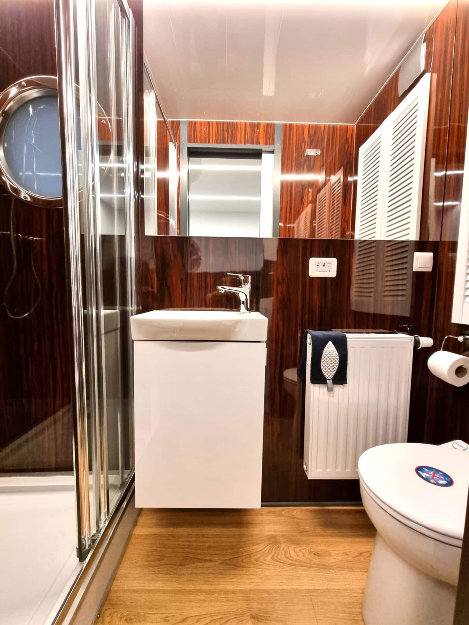Kabina prysznicowa 80 x 80, szafka z umywalką, WC z maceratorem, lustro, szafka na piec gazowy dwufunkcyjny.