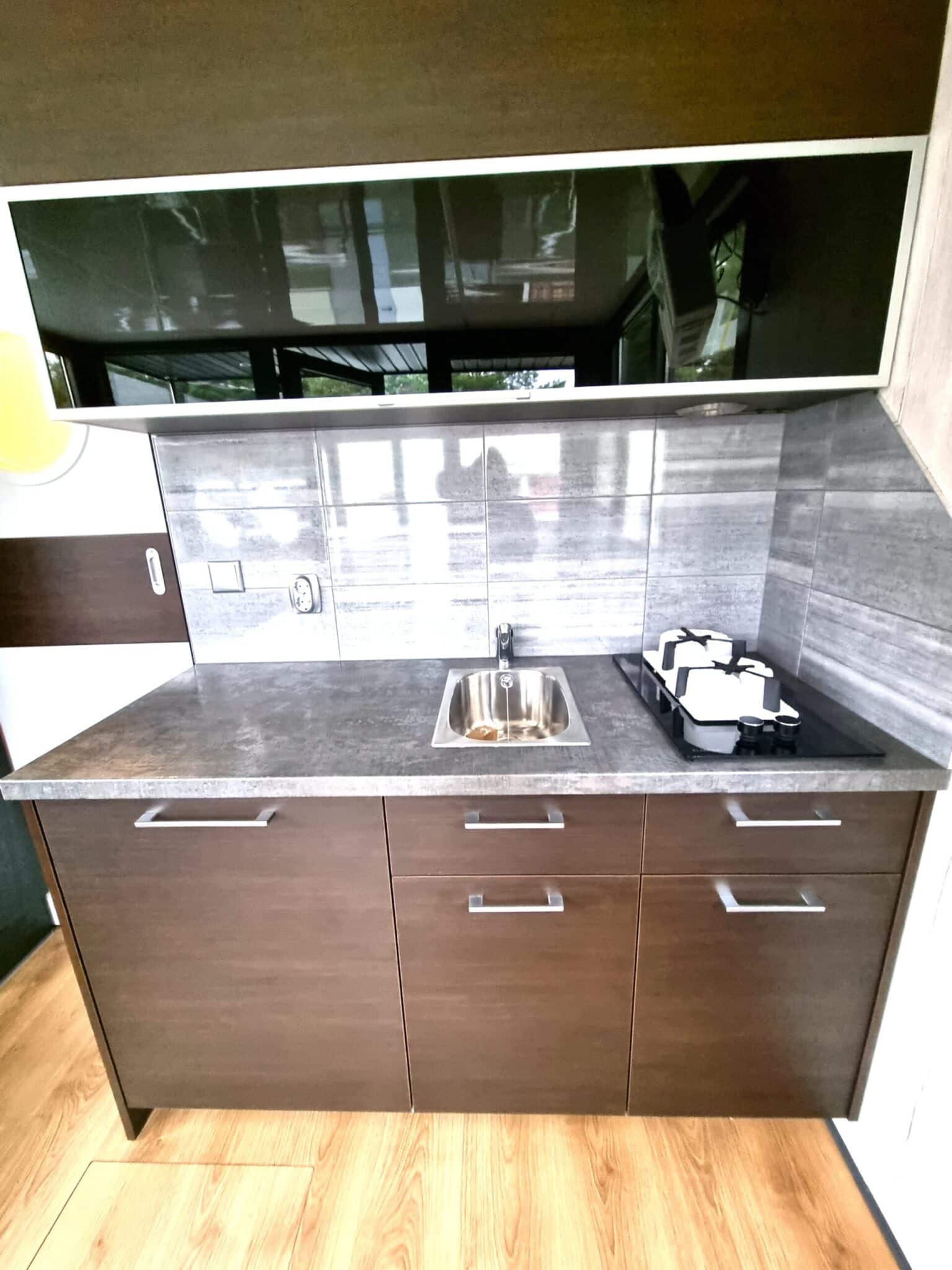 Kuchenka gazowa 2-palnikowa, zlewozmywak, lodówka zabudowana pod blatowa, szafki kuchenne.