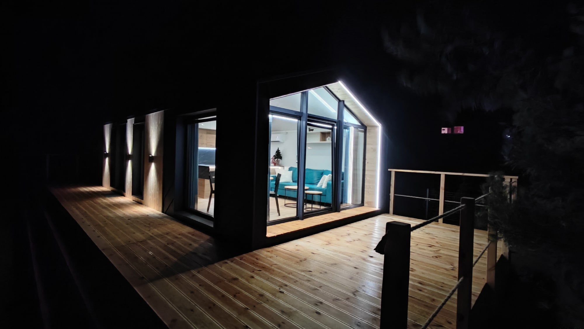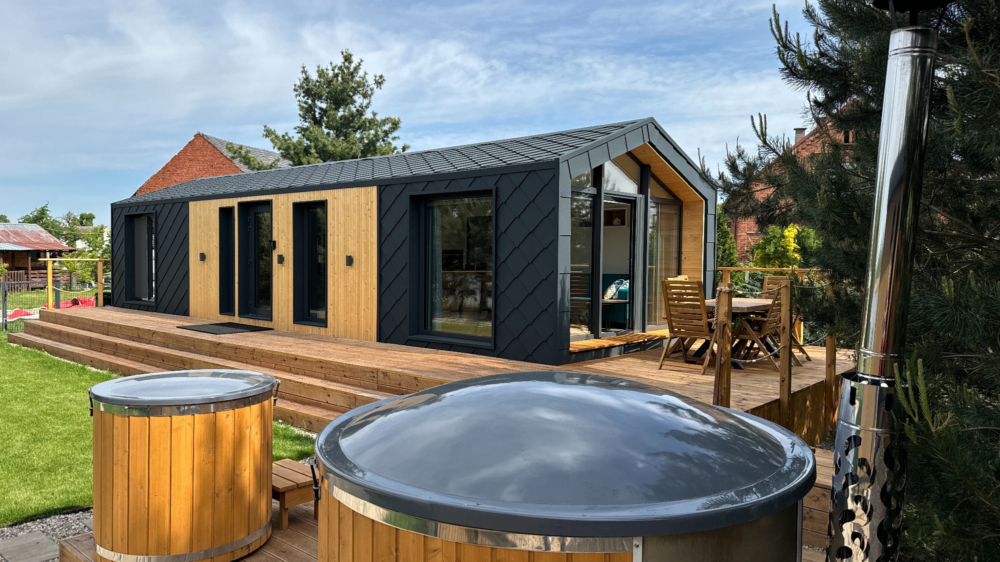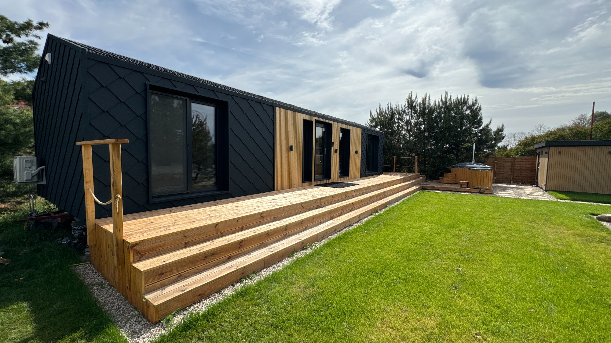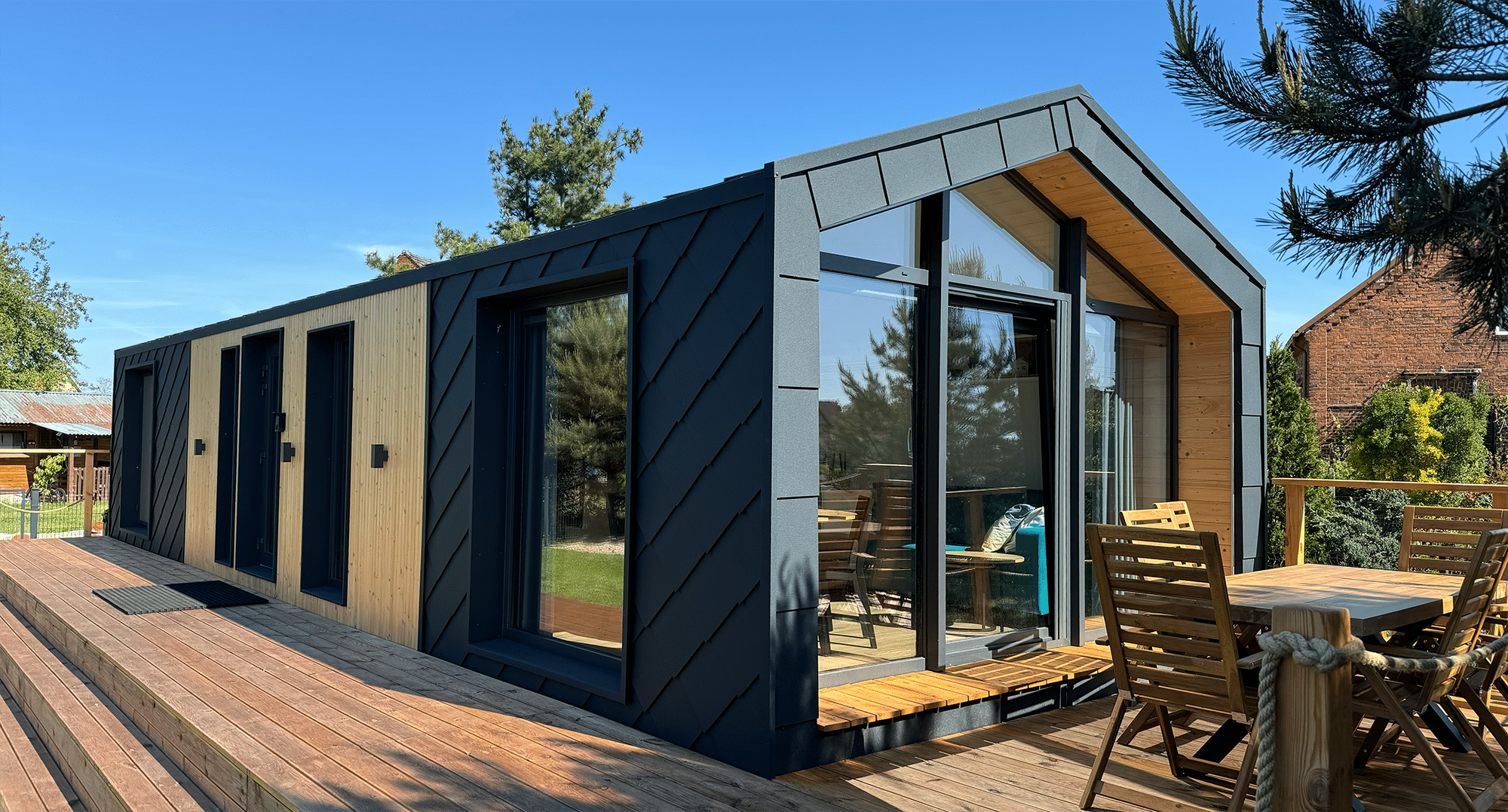 Połączyliśmy pokrycie dachu z elewacją nadając domkowi nowoczesny wygląd. Pozwoliło to nam na rezygnację z orynnowania, ponieważ woda z dachu ścieka po elewacji. Łupek fasadowy nie wymaga konserwacji. Jest łatwy w czyszczeniu i nie trzeba go malować.