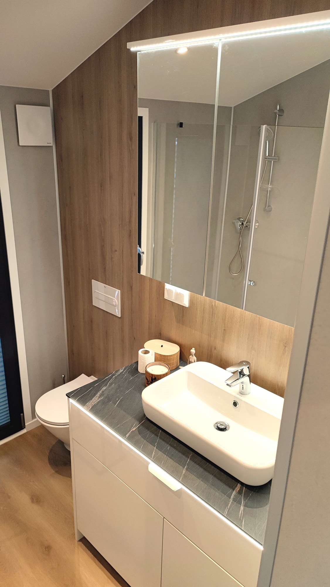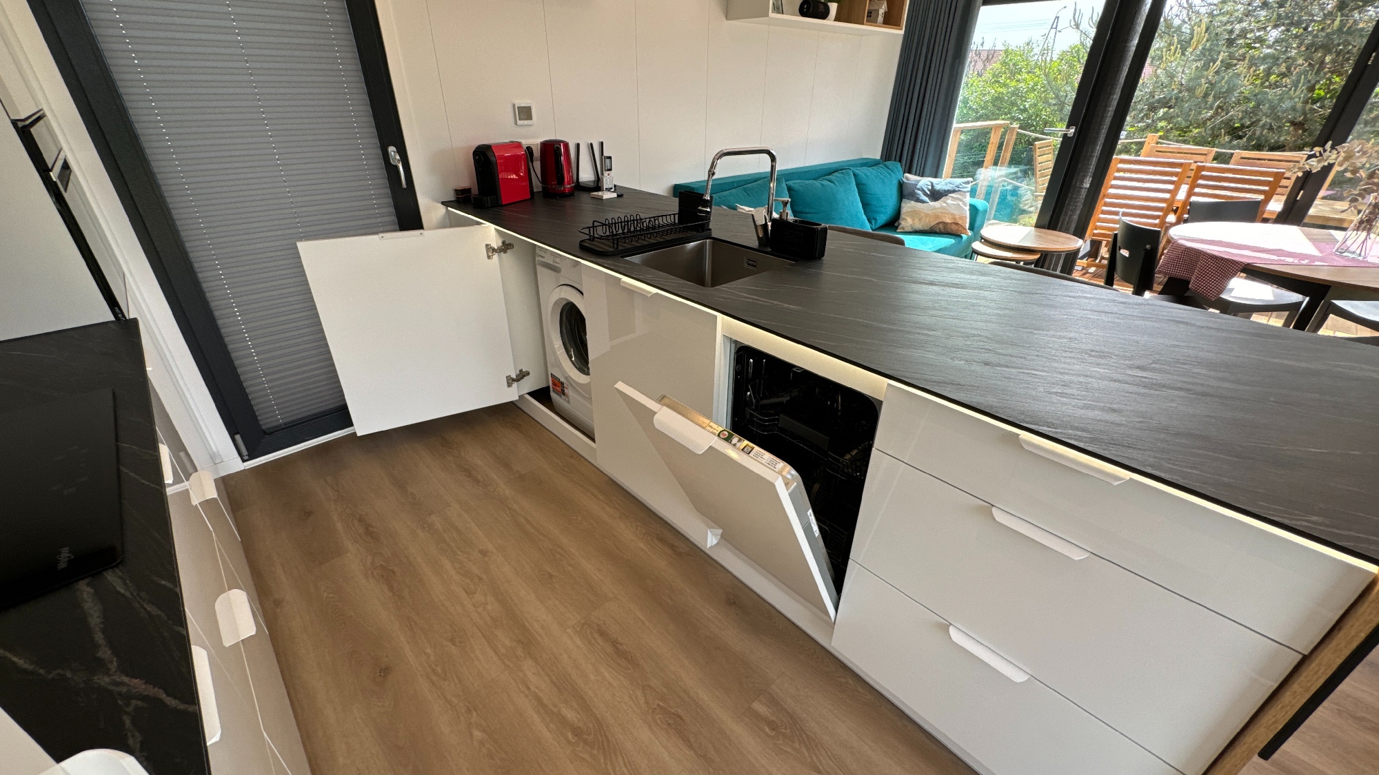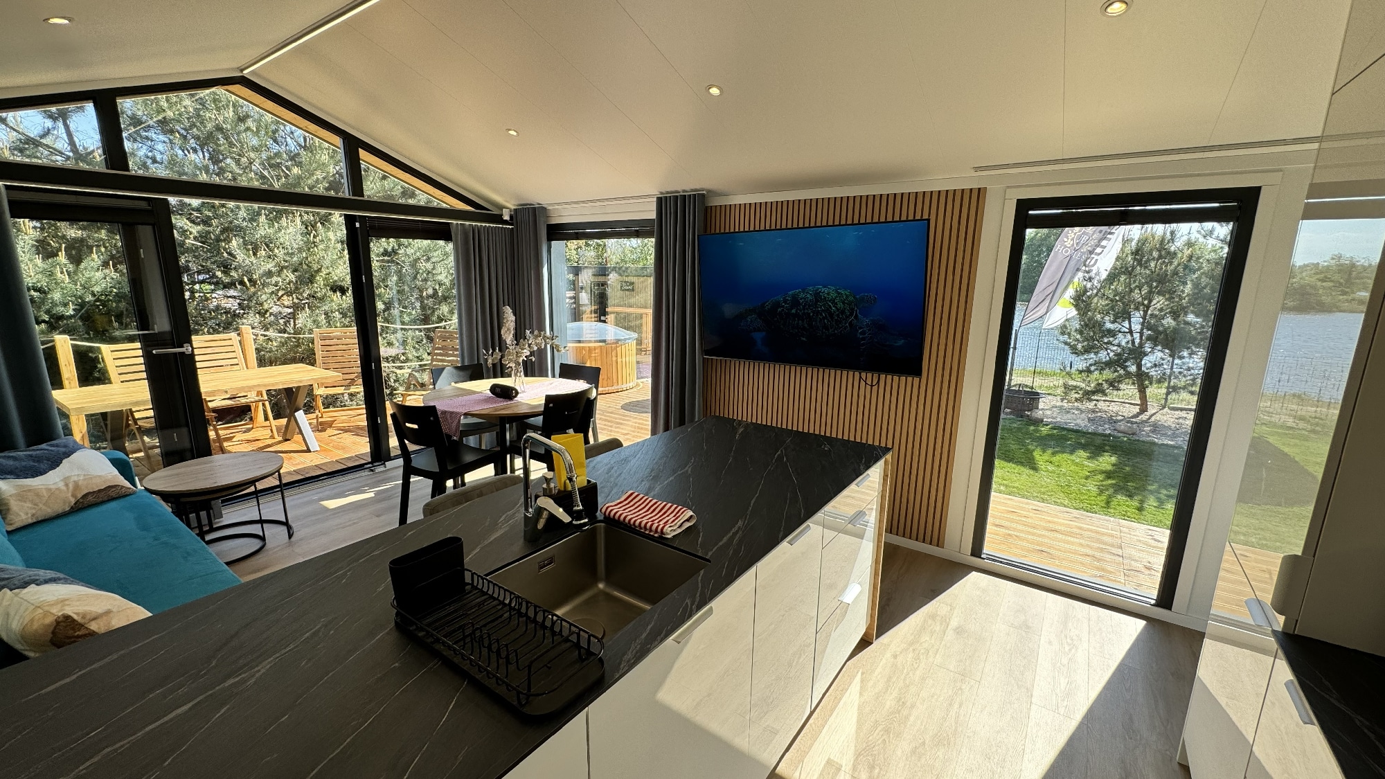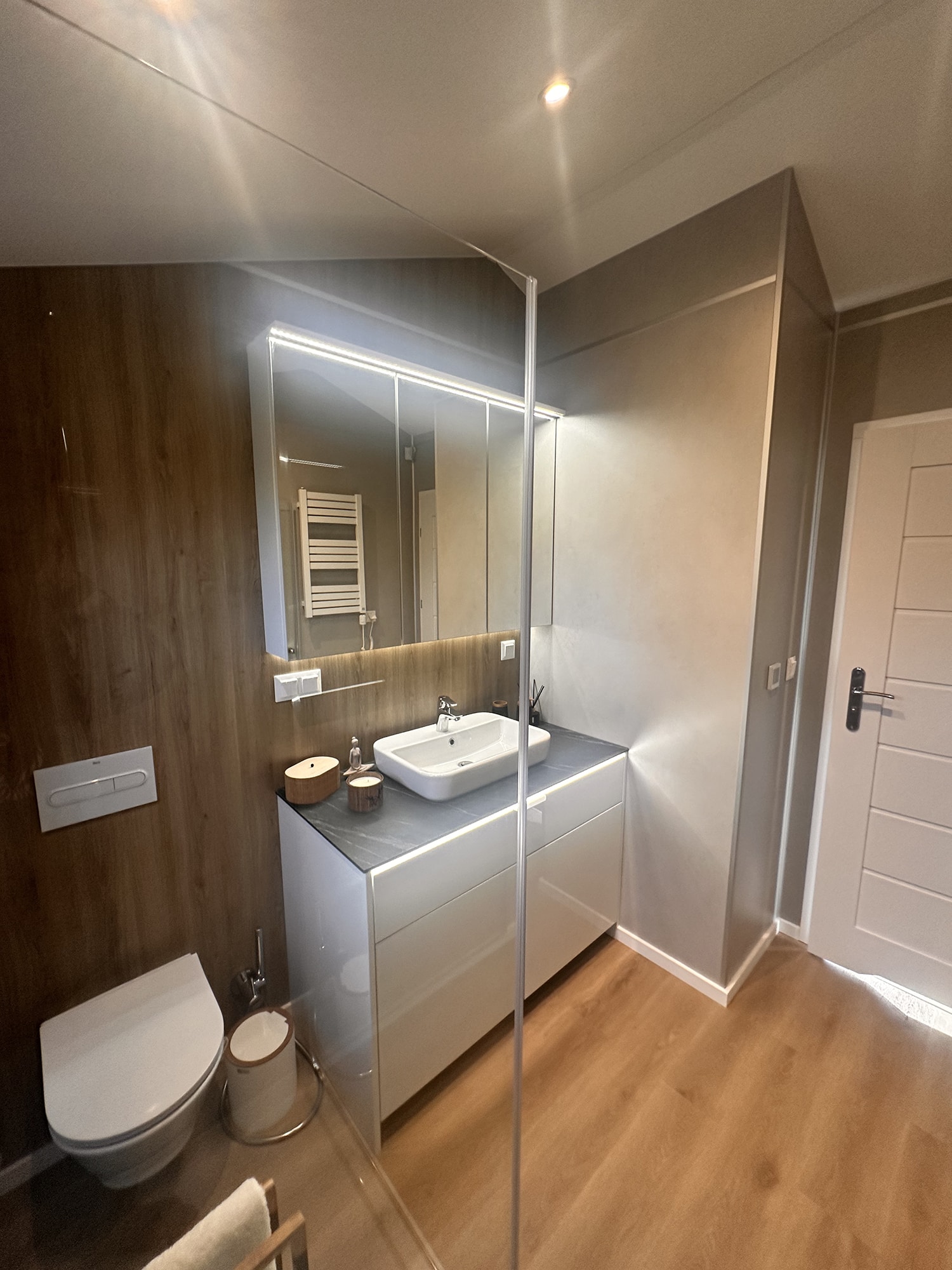 Połączyliśmy pokrycie dachu z elewacją nadając domkowi nowoczesny wygląd. Pozwoliło to nam na rezygnację z orynnowania, ponieważ woda z dachu ścieka po elewacji. Łupek fasadowy nie wymaga konserwacji. Jest łatwy w czyszczeniu i nie trzeba go malować.