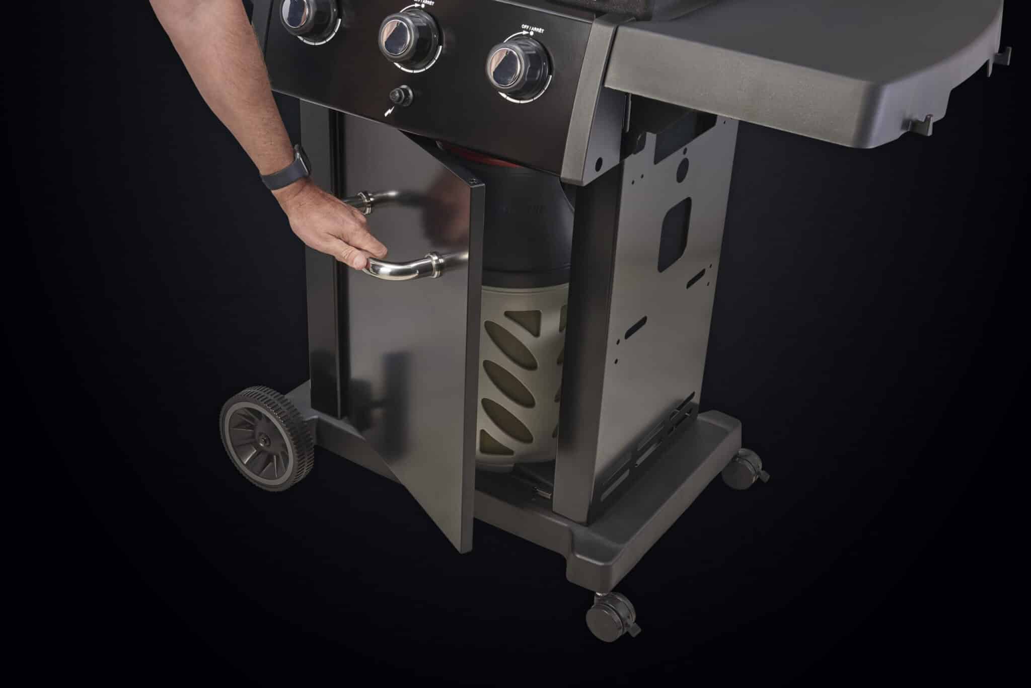 Wózek grilla o sztywnej konstrukcji z szafką na 11 kg butlę z gazem z kołnierzem.