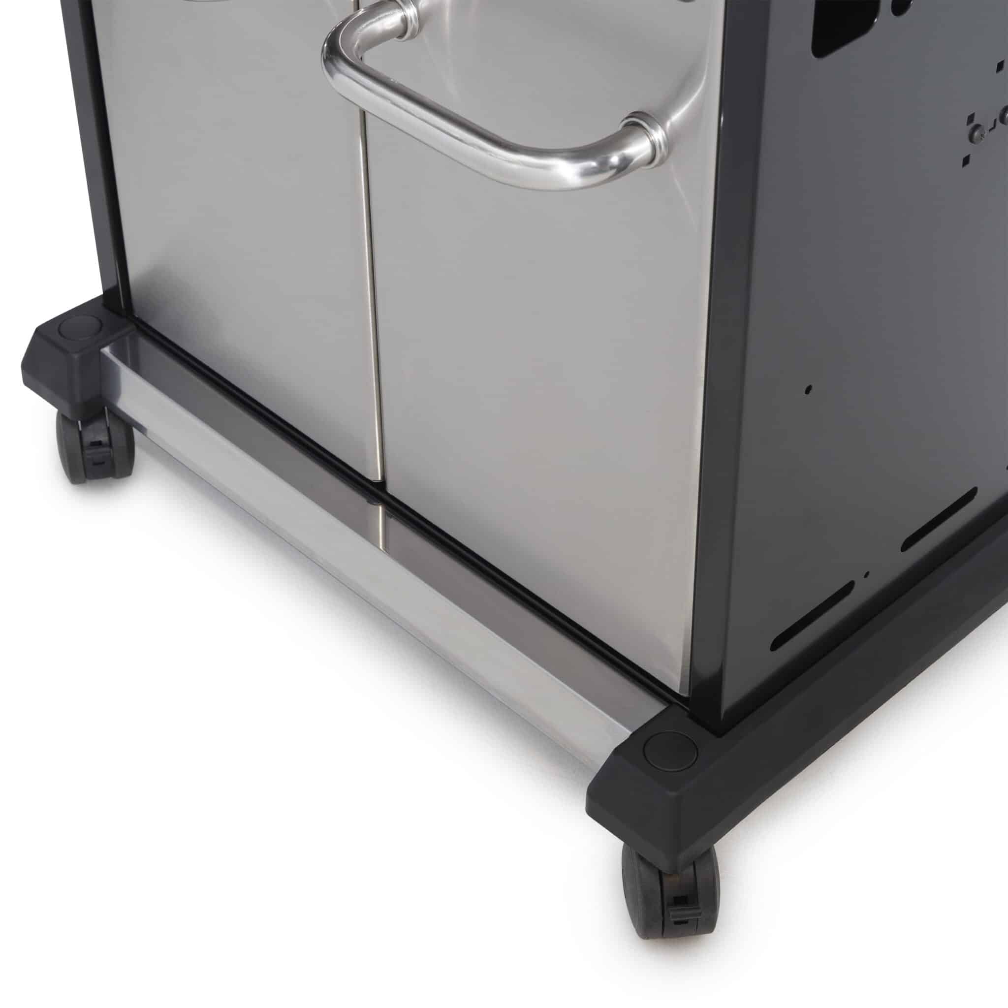 Wózek grilla o sztywnej konstrukcji z szafką na 11 kg butlę z gazem z kołnierzem i szafką na akcesoria.